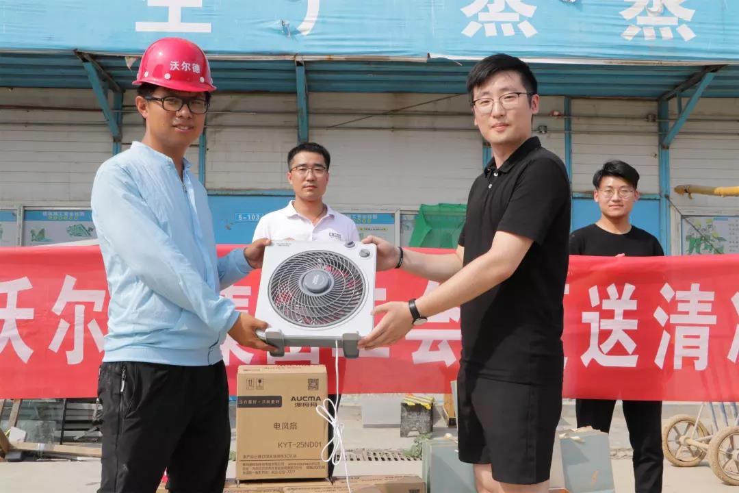 為做好防暑降溫工作,保障施工一線人員的健康權(quán)益,改善員工生產(chǎn)生活條件,2018年7月19日,沃爾德集團(tuán)工會(huì)開展了“夏送清涼”活動(dòng)。為奮戰(zhàn)在一線的員工們發(fā)放了電風(fēng)扇、茶葉、西瓜等防暑降溫物品,把清涼送到了施工一線,把關(guān)懷送到大家心坎。