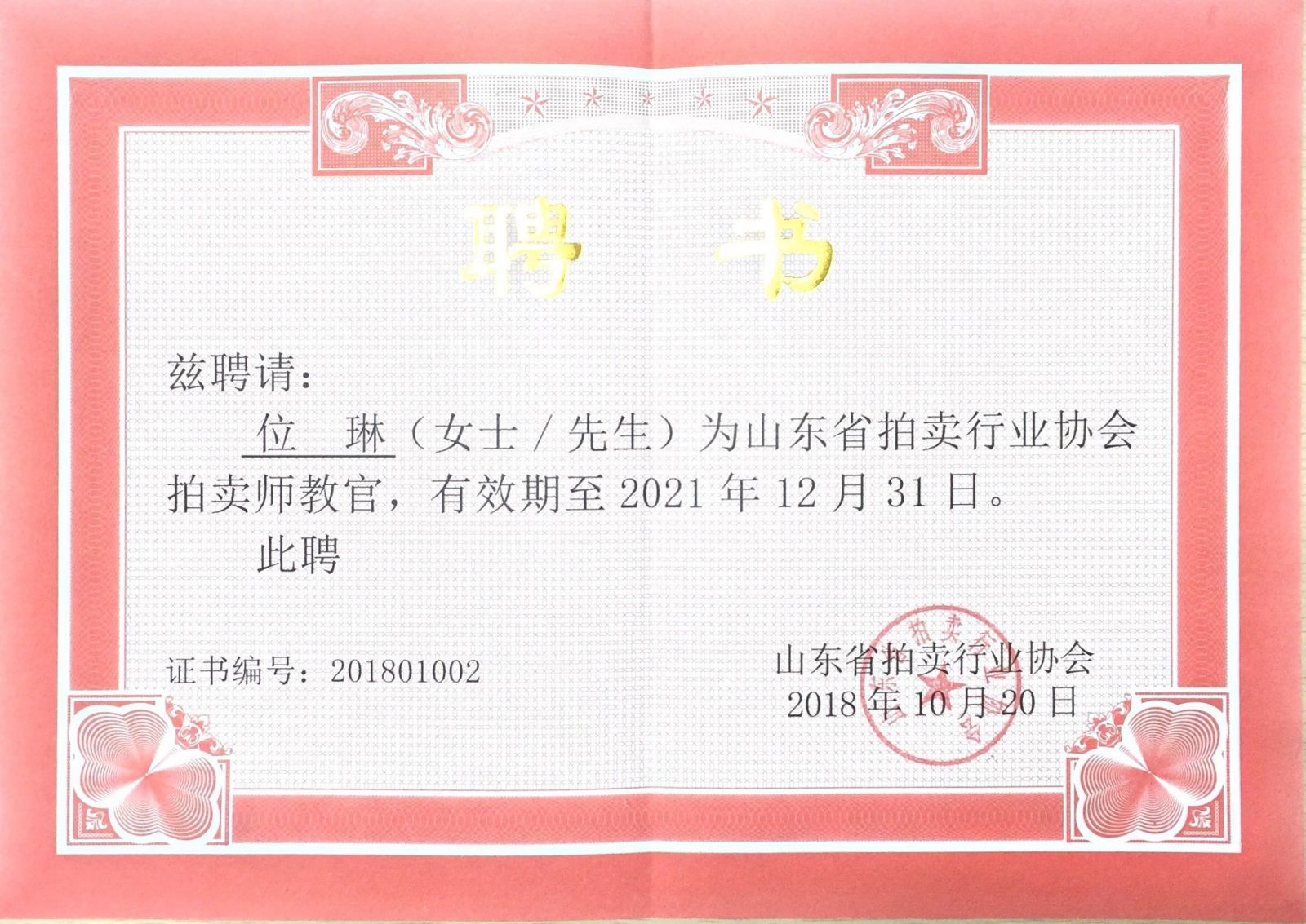2018年10月20日,山東省拍賣師教官工作會議在泉城濟南順利召開。金諾國際拍賣有限公司董事長商雪梅、總經理位琳入選為山東省拍賣行業協會首批拍賣師教官,山東省拍賣行業協會會長李偉、山東省拍賣行業協會副會長、沃爾德集團董事長林擘分別向首批拍賣師教官頒發了聘書。