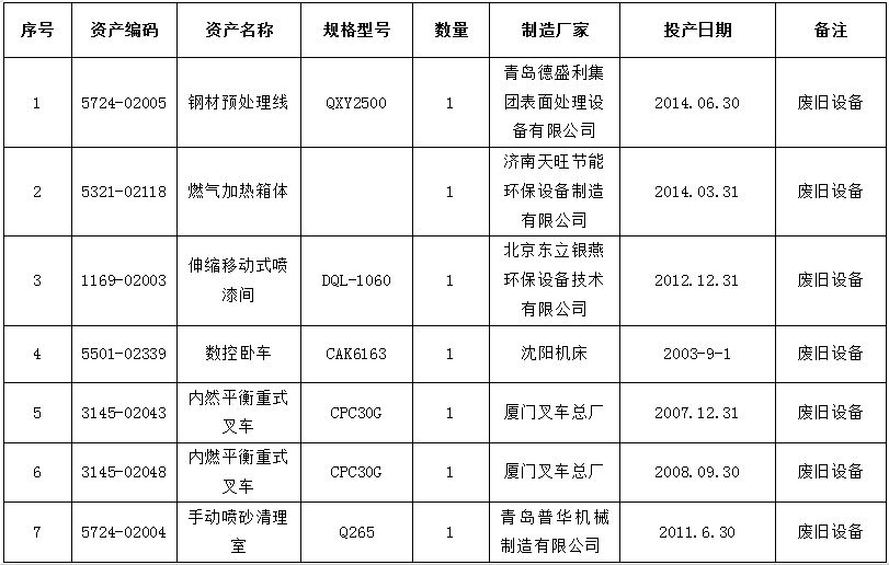 受委托,我公司定于2019年4月26日上午10時在中國拍賣行業協會網絡拍賣平臺(http://paimai.caa123.org.cn)公開拍賣廢舊設備及計量設備一宗(包括鋼材預處理線、伸縮移動式噴漆間、內燃平衡重式叉車等,詳見清單)。