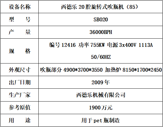 標(biāo)的一:西德樂(lè)20腔旋轉(zhuǎn)式吹瓶機(jī),起拍價(jià) 160萬(wàn)元(不含稅),標(biāo)的設(shè)有保留價(jià),競(jìng)買(mǎi)保證金15萬(wàn)元。已拆機(jī),設(shè)備完好。