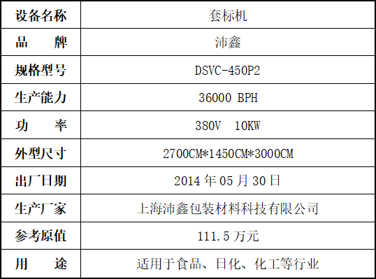 標(biāo)的四:套標(biāo)機(jī),起拍價(jià):30萬(wàn)元(不含稅),標(biāo)的設(shè)有保留價(jià),競(jìng)買(mǎi)保證金6萬(wàn)元。已拆機(jī),設(shè)備完好。