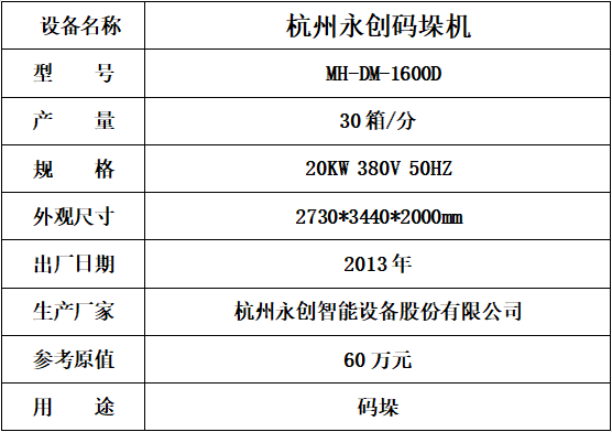 標(biāo)的六:永創(chuàng)碼垛機(jī),起拍價(jià):15萬(wàn)元(不含稅),標(biāo)的設(shè)有保留價(jià),競(jìng)買(mǎi)保證金3萬(wàn)元。已拆機(jī),設(shè)備完好。