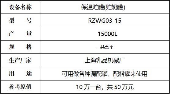 標(biāo)的七:上海乳品廠5個(gè)儲(chǔ)奶罐,起拍價(jià):40萬(wàn)元(不含稅),標(biāo)的設(shè)有保留價(jià),競(jìng)買(mǎi)保證金8萬(wàn)元。已拆機(jī),設(shè)備完好。