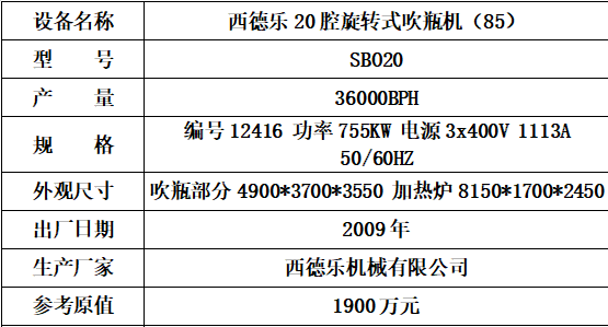標(biāo)的一:西德樂20腔旋轉(zhuǎn)式吹瓶機,起拍價 144萬元(不含稅),標(biāo)的設(shè)有保留價,競買保證金10萬元。已拆機,設(shè)備完好。