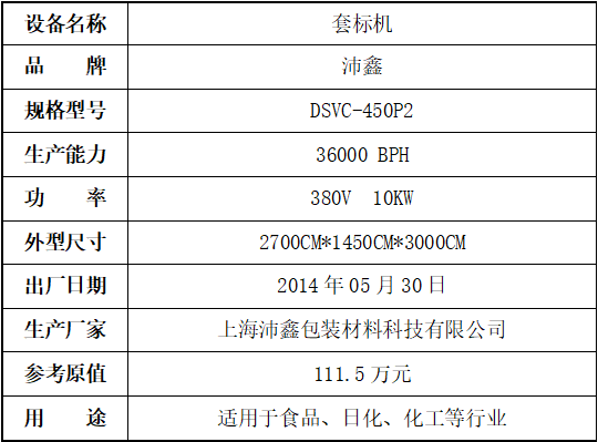 標(biāo)的四:套標(biāo)機,起拍價:27萬元(不含稅),標(biāo)的設(shè)有保留價,競買保證金5萬元。已拆機,設(shè)備完好。