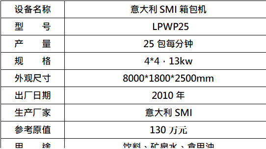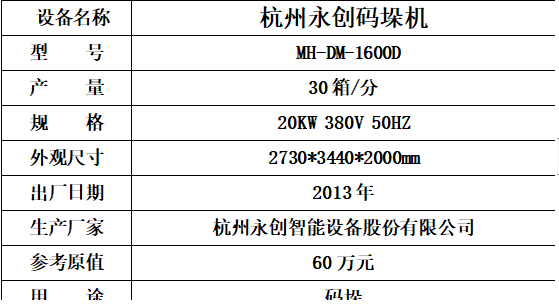 標(biāo)的六:永創(chuàng)碼垛機,起拍價:135000元(不含稅),標(biāo)的設(shè)有保留價,競買保證金3萬元。已拆機,設(shè)備完好。