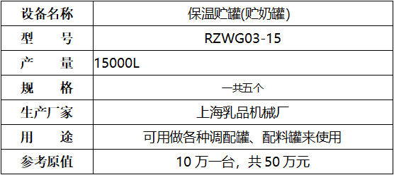 標(biāo)的七:上海乳品廠5個儲奶罐,起拍價:36萬元(不含稅),標(biāo)的設(shè)有保留價,競買保證金8萬元。已拆機,設(shè)備完好。