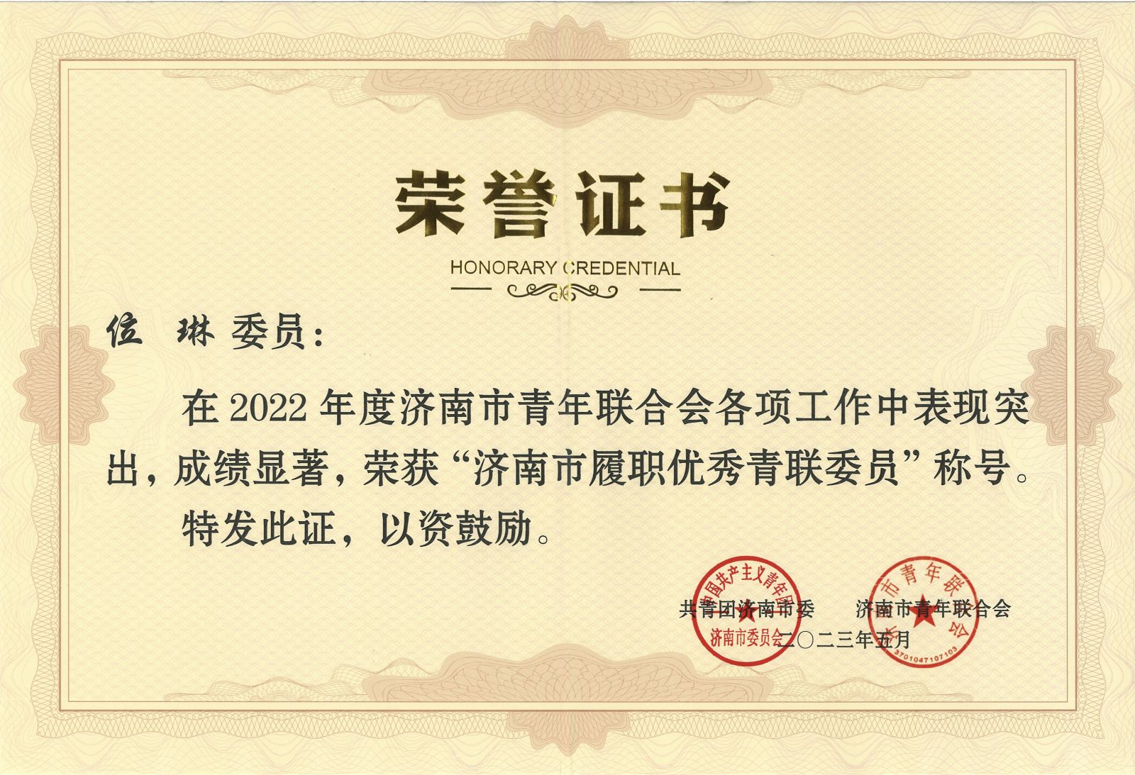 為進一步貫徹落實習近平新時代中國特色社會主義思想主題教育精神要求,為加快建設“強新優富美高”新時代社會主義現代化強省會匯聚更大青春力量,近日,泉城青聯大講堂暨濟南市青年團體骨干青馬工程培訓班成功舉辦。濟南市青年聯合會對2022年度各項工作中表現突出的委員進行表彰頒發榮譽證書,金諾國拍集團總裁位琳榮獲2022年度“濟南市履職優秀青聯委員”稱號。