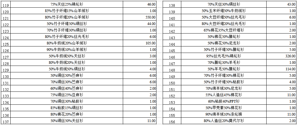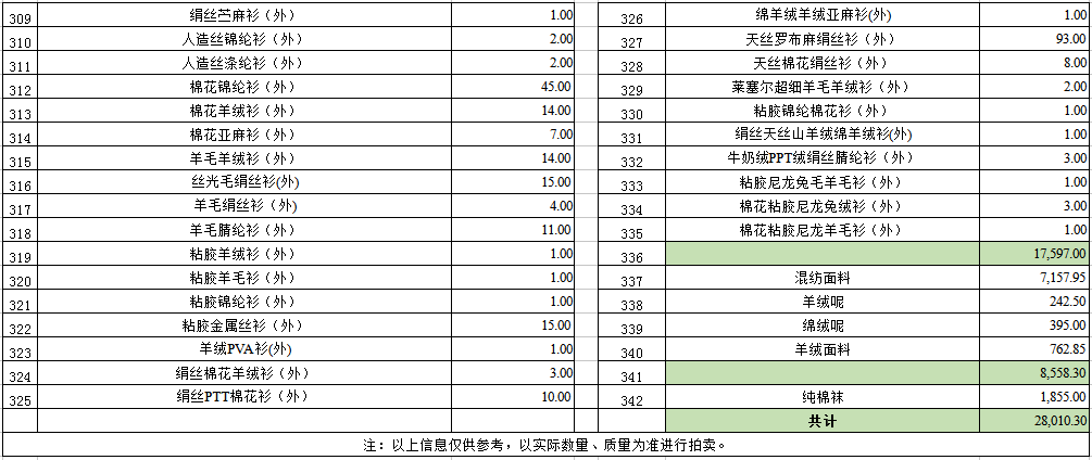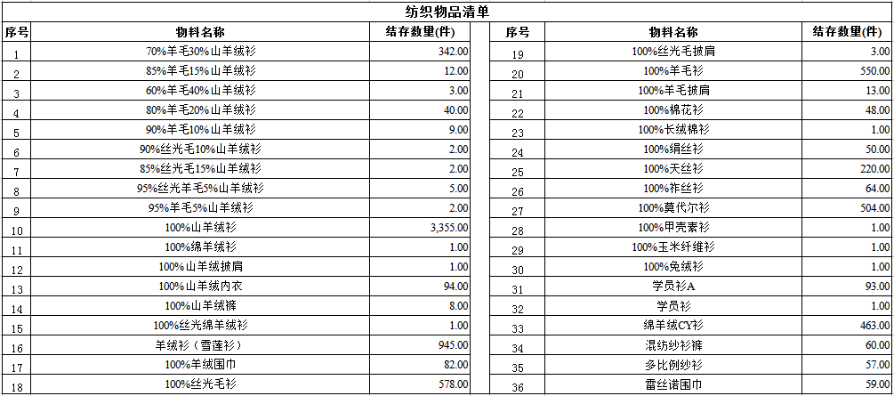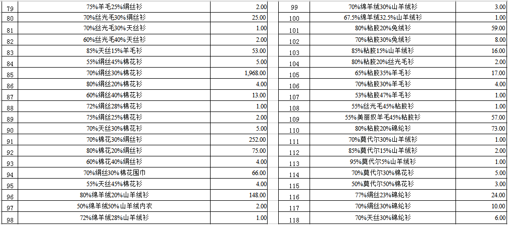 紡織物品一宗(羊絨衫、莫代爾衫、棉花衫、混紡面料等)。