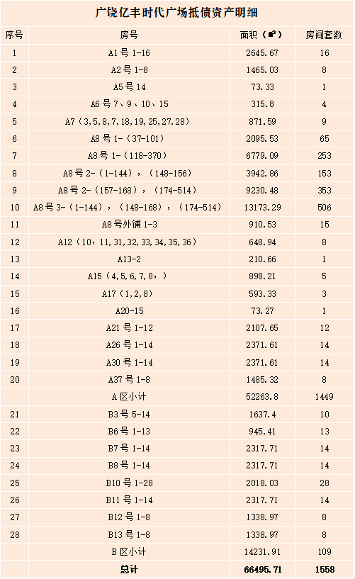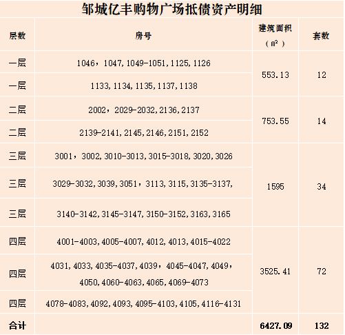 基本情況:該抵債資產(chǎn)位于東營市廣饒縣廣饒濰高路888號億豐國際時代廣場,廣饒老汽車站西鄰。總建筑面積66495.71㎡,房間1558套,經(jīng)法院裁定抵債,未辦理過戶手續(xù)。