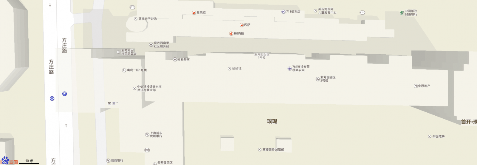 餐飲:方莊著名美食一條街,分布十余家餐館:全聚德、金鼎軒、都一處、順峰、小土豆、金山城、麥當勞、肯德基、必勝客、Mr. Pizza等